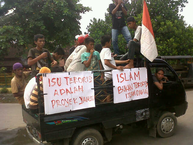 “Kita berharap tidak pernah terjadi lagi aksi penolakan jenazah korban kebrutalan Densus 88 di Bima, ummat Islam tidak boleh terprovokasi, masak lebih percaya Densus 88 yang kaki tangan Yahudi itu dibandingkan sesama Muslim?” ujar Koordinator Aksi, Abdul Haris dalam orasinya.