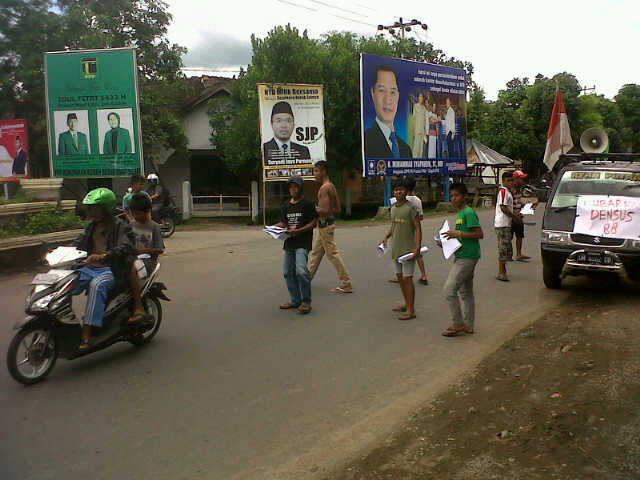 Bukan hanya orasi di tempat-tempat ramai, seperti persimpangan dan pasar. Massa juga membagikan selebaran sebanyak 1500 lembar. Isi pernyataan nyaris sama sebagaimana yang diusung Himpunan Mahasiswa Islam (HMI) Cabang Bima saat aksi Sabtu (26/1/2013) lalu.